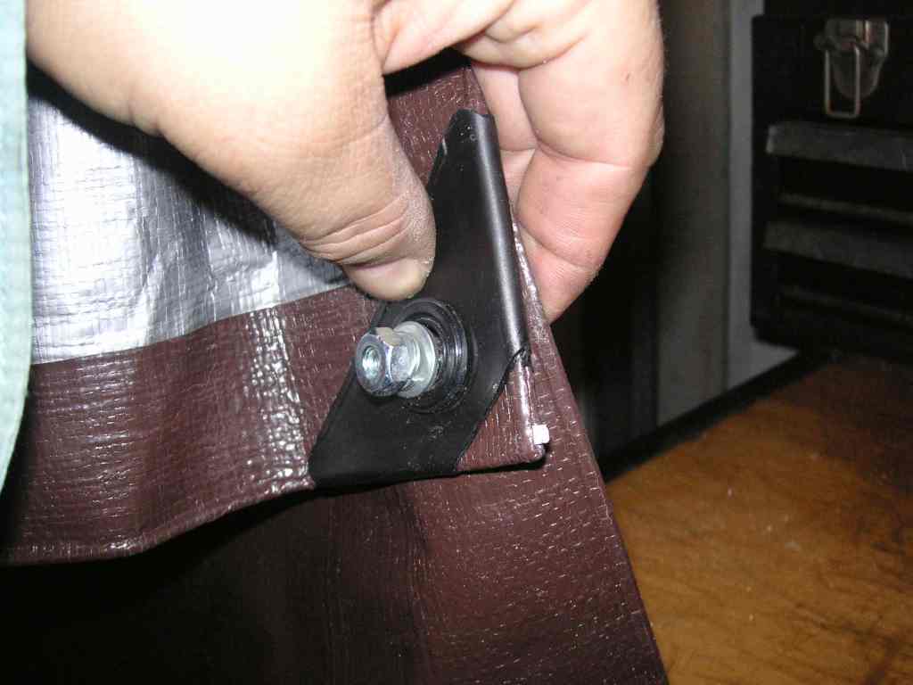 ![]() Here is how I held up the middle of the tarp. Two 1/4-20 bolts, one going through a grommet on the tarp edge and the other just punched through the tarp edge. ![]() This is the heavy-duty tarp I got at Home Depot. The ripped one was from Lowes and I liked it better, it is all silver on one side, this one has a brown edge. The new one seems a bit cheaper too. | ![]() |